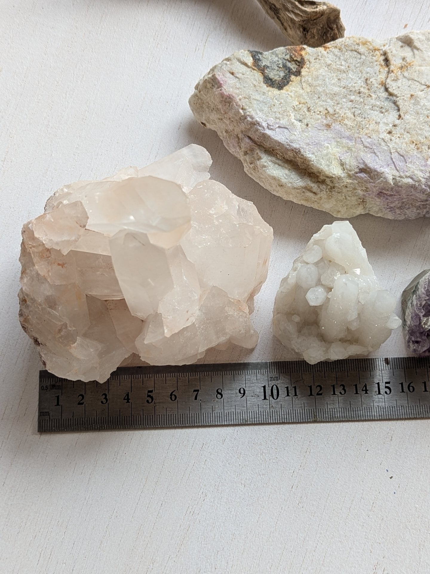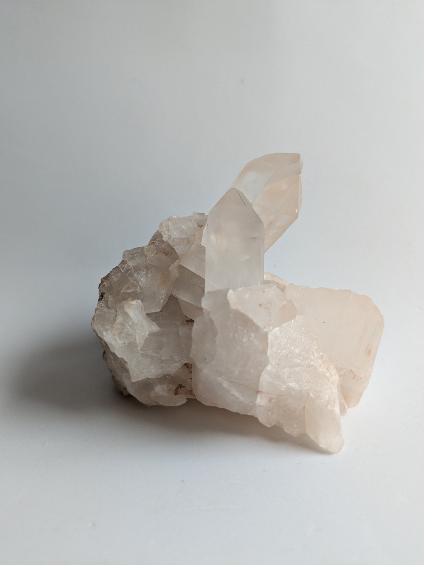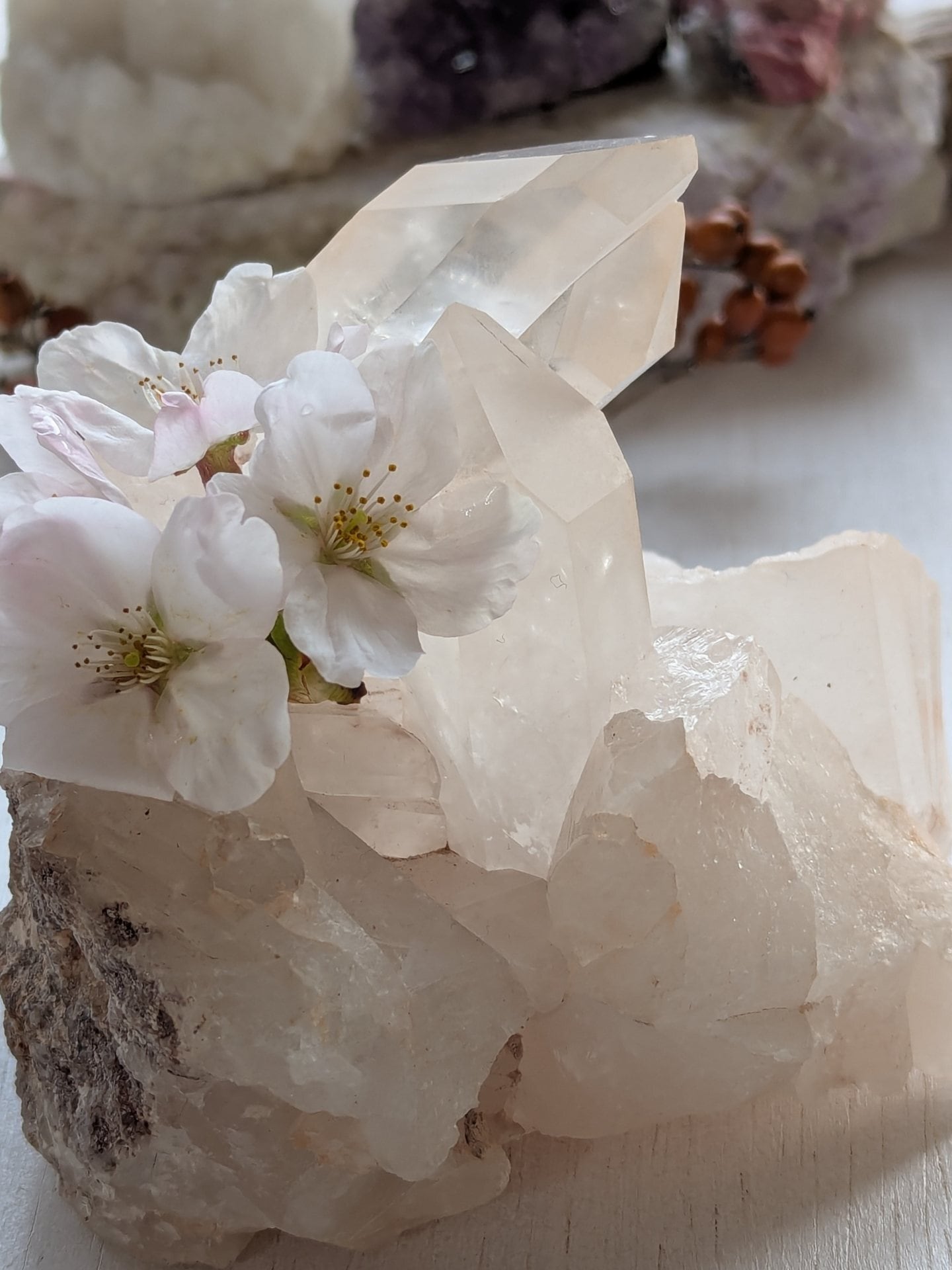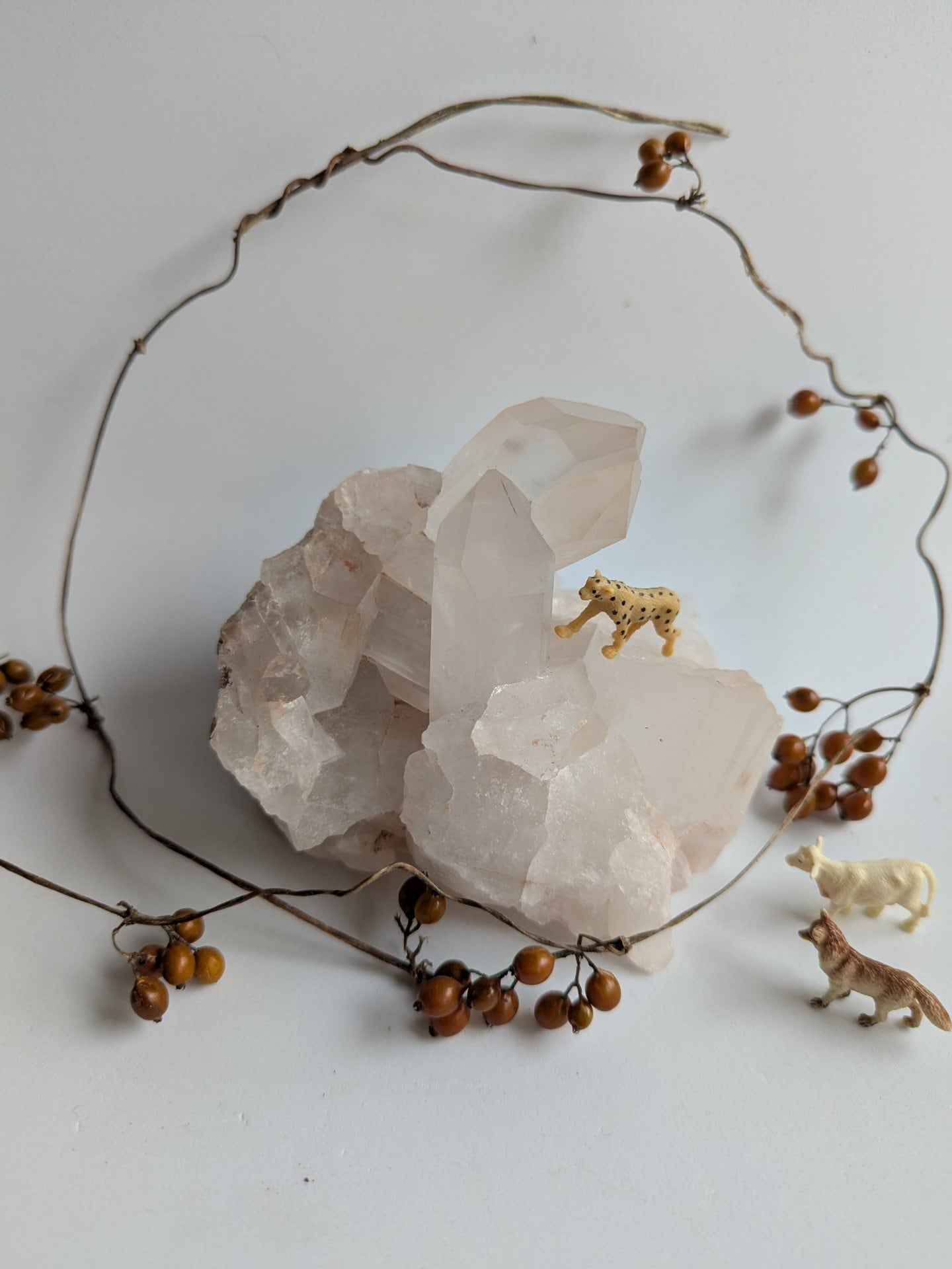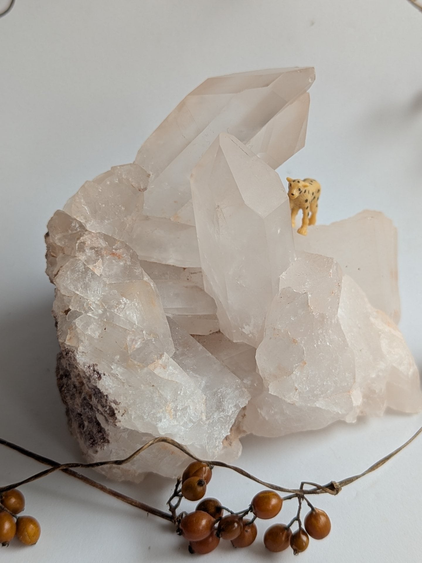 一番背の高い結晶は蝕像ありのウインドウ&平行四辺形が上下ダブルで並んでいる珍しいタイムリンク&ツイン、寄り添う2番目に高い結晶は左右対称の八角形ファセット、グラウンディングといわれる形状です。ほかはブリッジもありマスタークリスタル形状がわんさか祭りな穏やかな叡智のクラスターです。宇宙図書館やレムリアの叡智と今を繋いでくれるクリスタル、まさにそのお役目のような石です。穏やかなマスターさん
