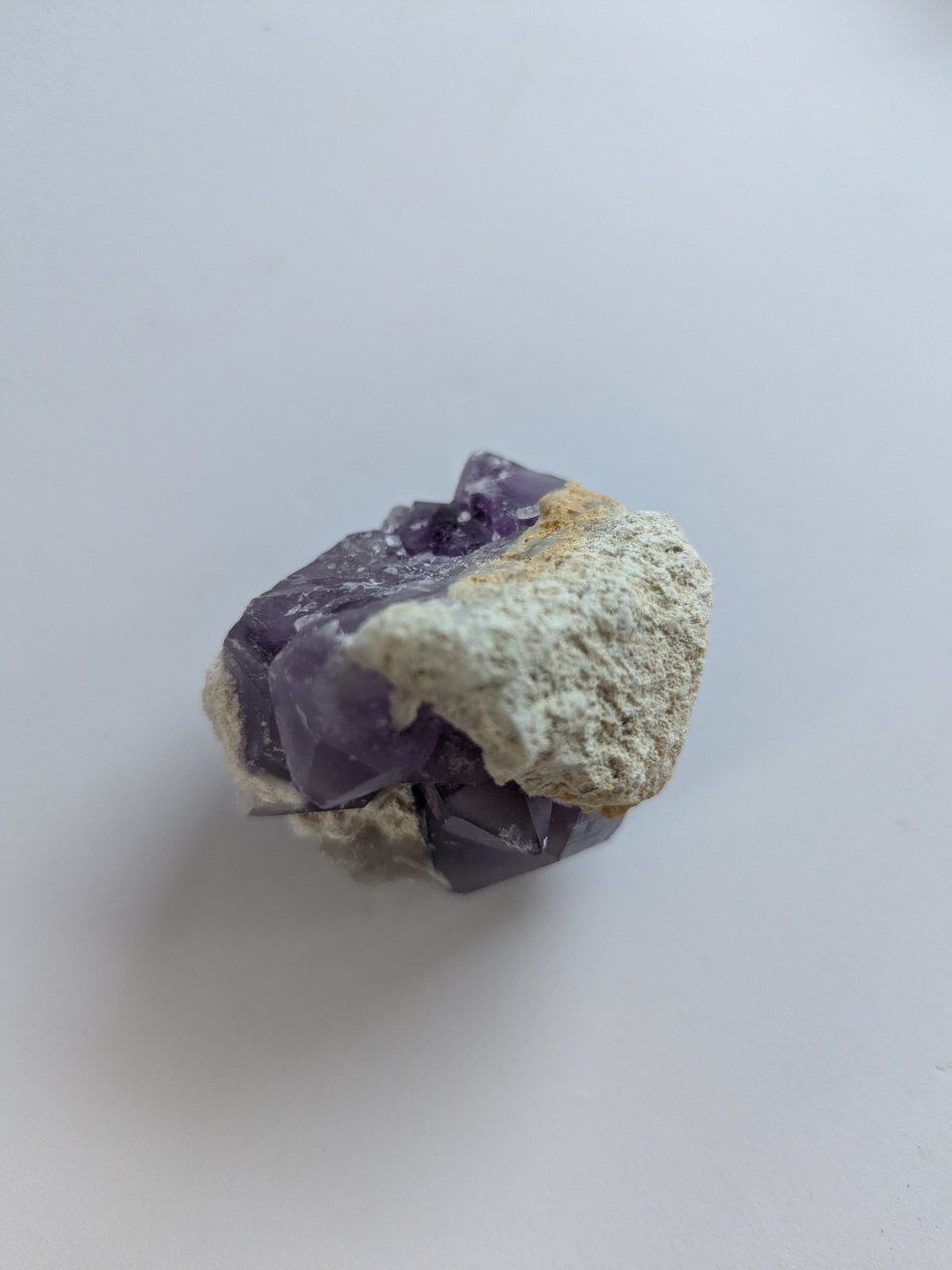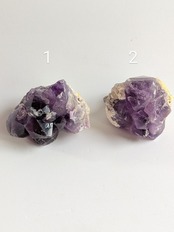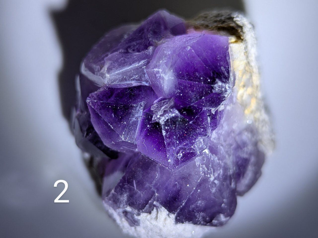 中に美しい濃い紫のゼリーを内包したようなグラデーションが美しい個体です。また光を当てますと中にきらきら燐光が反射します。アイオライトサンストーンに見られるアベンチュレッセンスのような光学効果のようでとても美しいです。