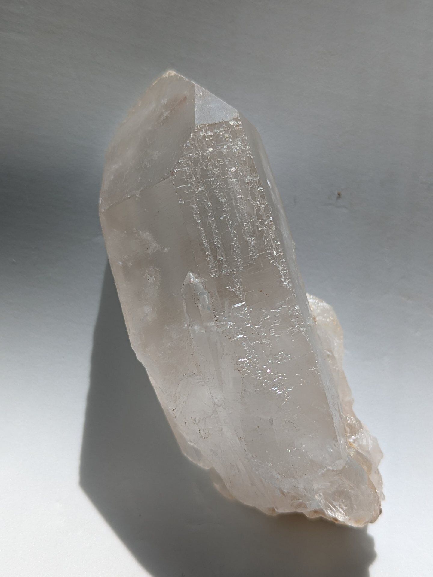 ヒマラヤ水晶の手からややはみ出る位の大きな水晶です。磨りガラス風でファセットには鱗のような模様、柱面には自然にできた5本線の蝕像、幾時代を超え様々な経験を得た好々爺みたいなポイントです。待つことの大切さ、機を見るあり方、力の貯め方、そんなフォローが得意です。行くときはサア行け!と背中おしてくれるし、そのタイミングの読み方が凄く絶妙な石です。待ち方をおしえてくれるだけであって、実は戦い方をおしえてくれている、本質はアクティブな存在なんだろな~というw