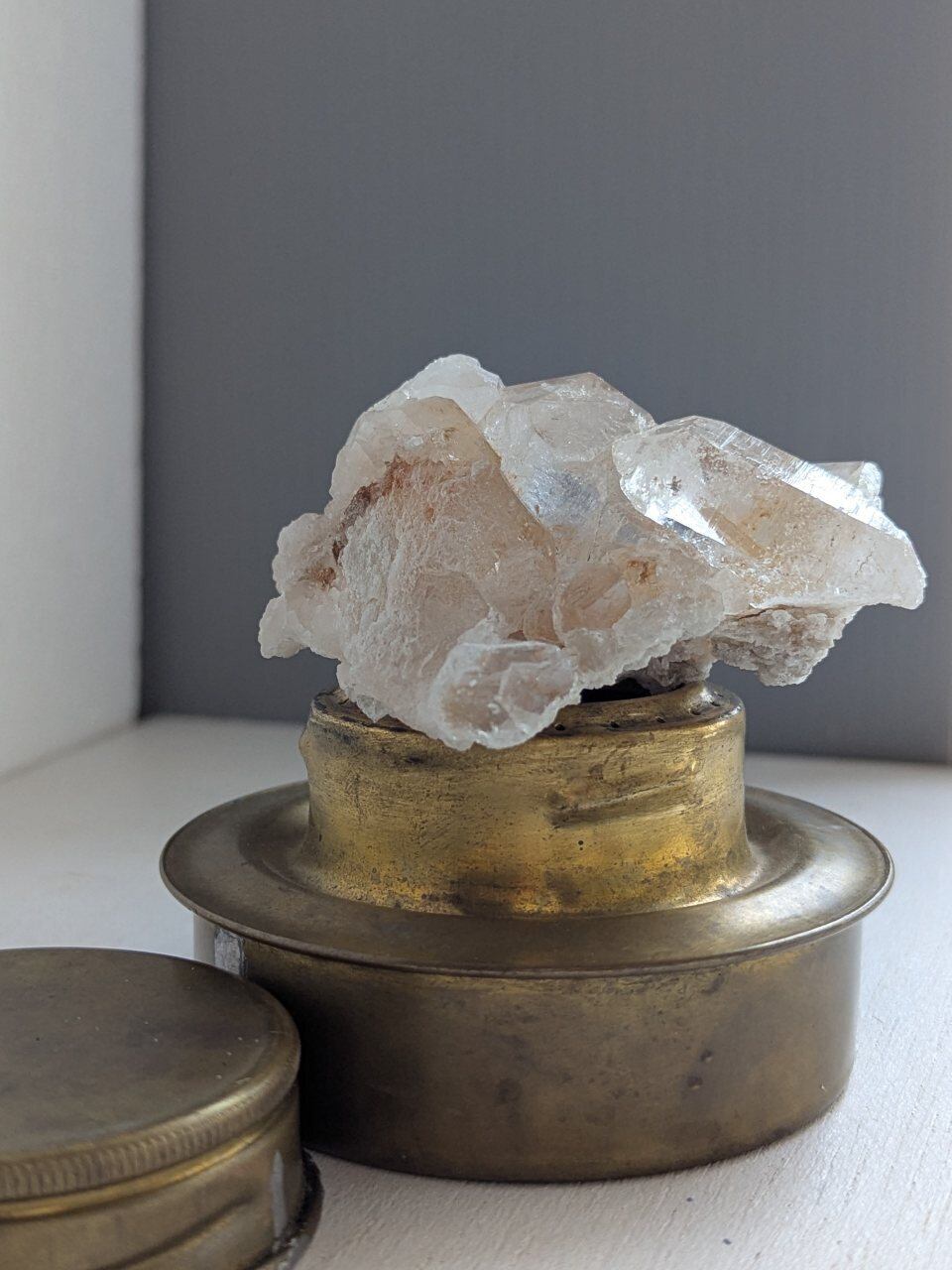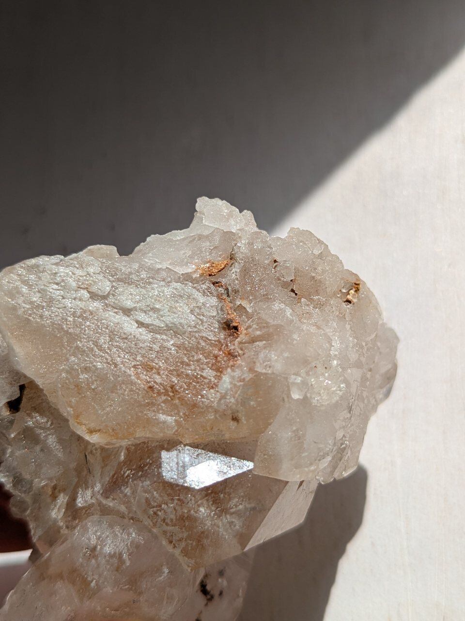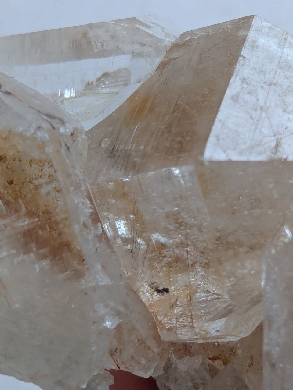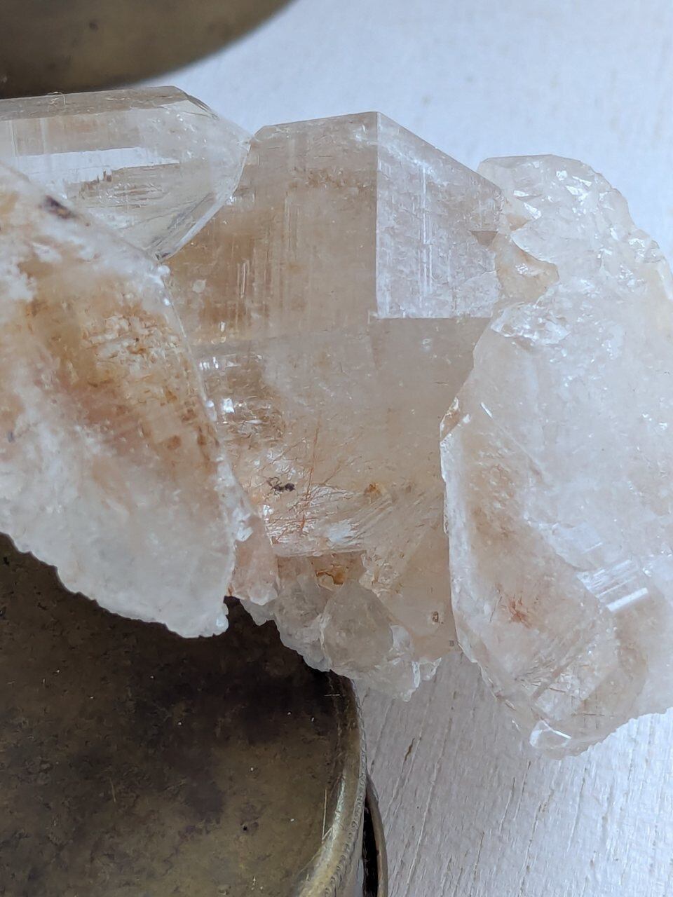 太めの結晶の集合体なクラスターです。透明度も高く中のルチルも見えやすいです。こちらは昼近くの午前中の太陽のようなエネルギー、働き初めていちばん身体も頭も慣れて動ける時間帯。なにか組み上げ、作り上げていく創造行動の実践的なエネルギー補助が得意なようです。蝕像と再結晶化の面もキラキラです。ナイスピース!