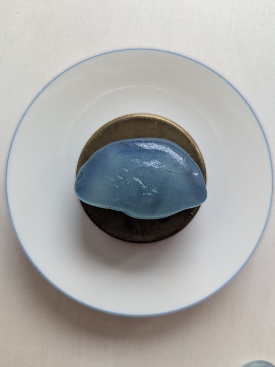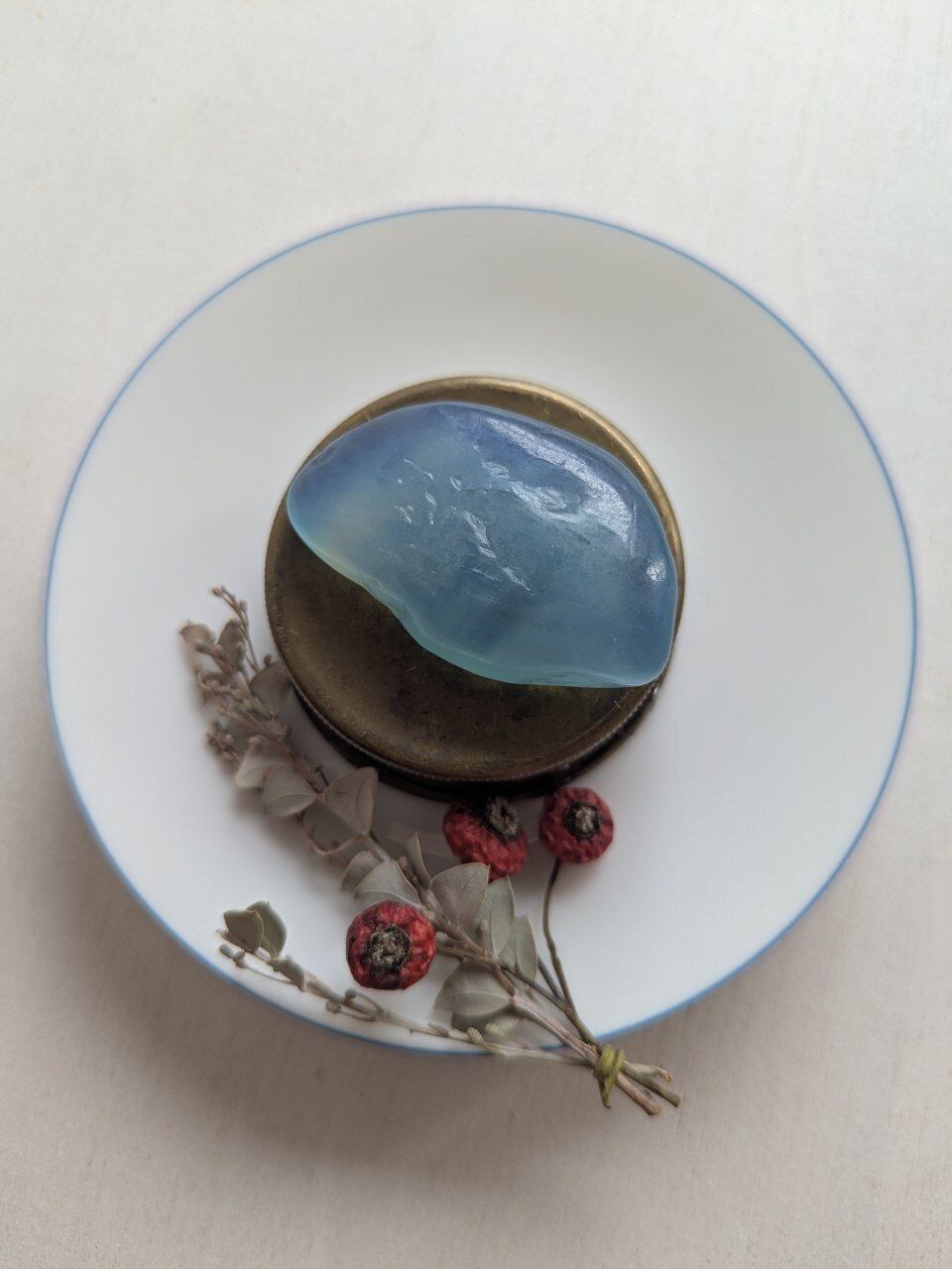 こっくりとした水色が可愛いお品、光にすかすと一変、オパールの遊色のような、朝焼けが始まる前の黄金の空のようなお姿が現れます。