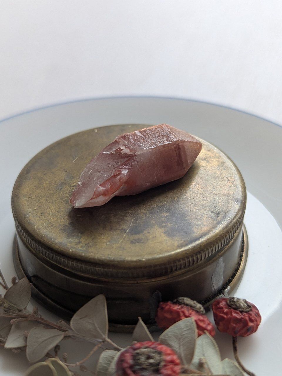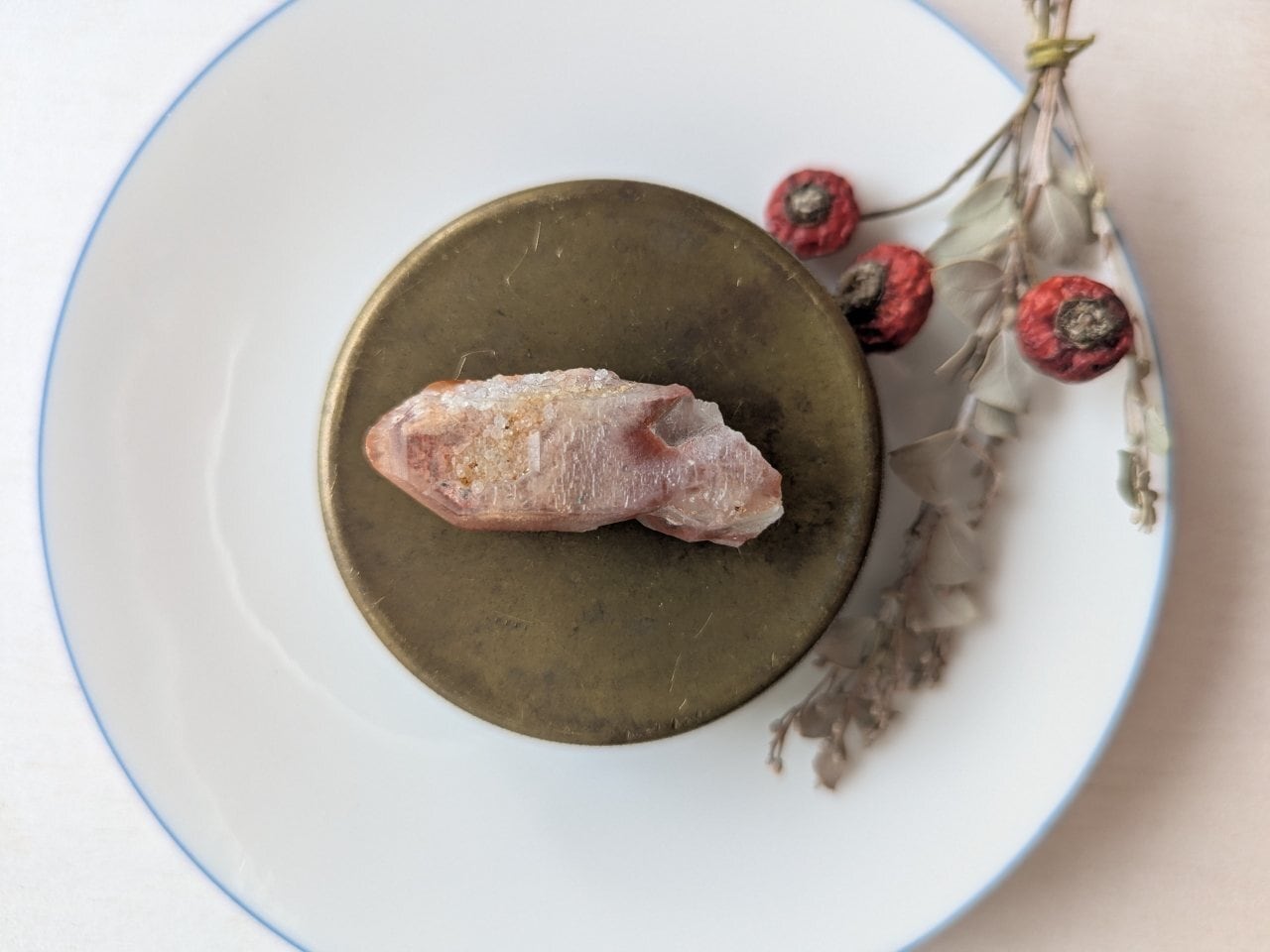 こちらは水晶に酸化鉄が含まれたことでできたモロッコ産天然の赤水晶です。中心の結晶の周りに酸化鉄や砂糖まぶしたような結晶がコーティングされており、通称ドリームコートレムリアンと言われるブラジルの水晶にも似たお姿ですがエネルギーはちかくともそれぞれがそれぞれで違っていいエネルギーだなぁと