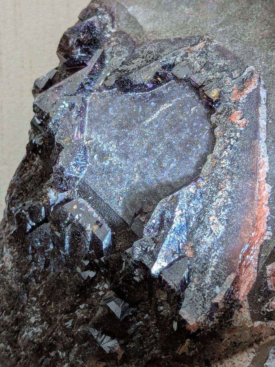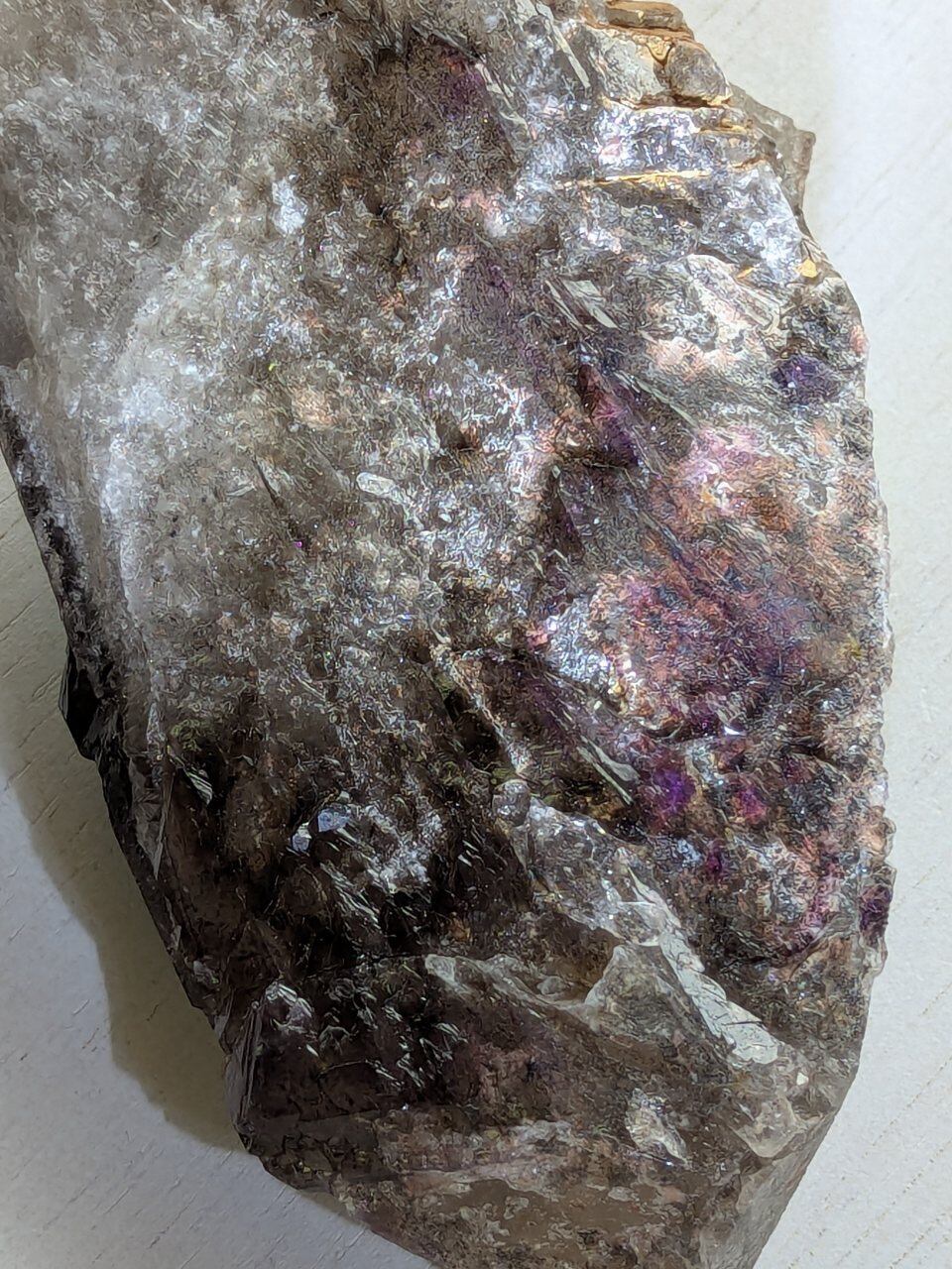 中心のスモーキークォーツにスーパーセブン的に様々な鉱物が内包されている黒水晶&アメシストのコーティング、燐光、一面セルフヒールド、カテドラル様再結晶等見れば見るほど発見が多い結晶です。子猫ちゃん位の重さはありますが、持っているだけでエネルギー充填と器の内側が整います。自分のエネルギー的境目から内側に響き整う感じです。コレクションにこの方がいらっしゃるこの安心感はええです。