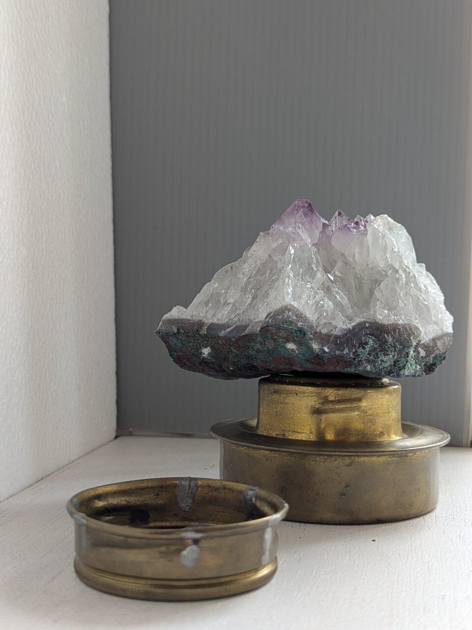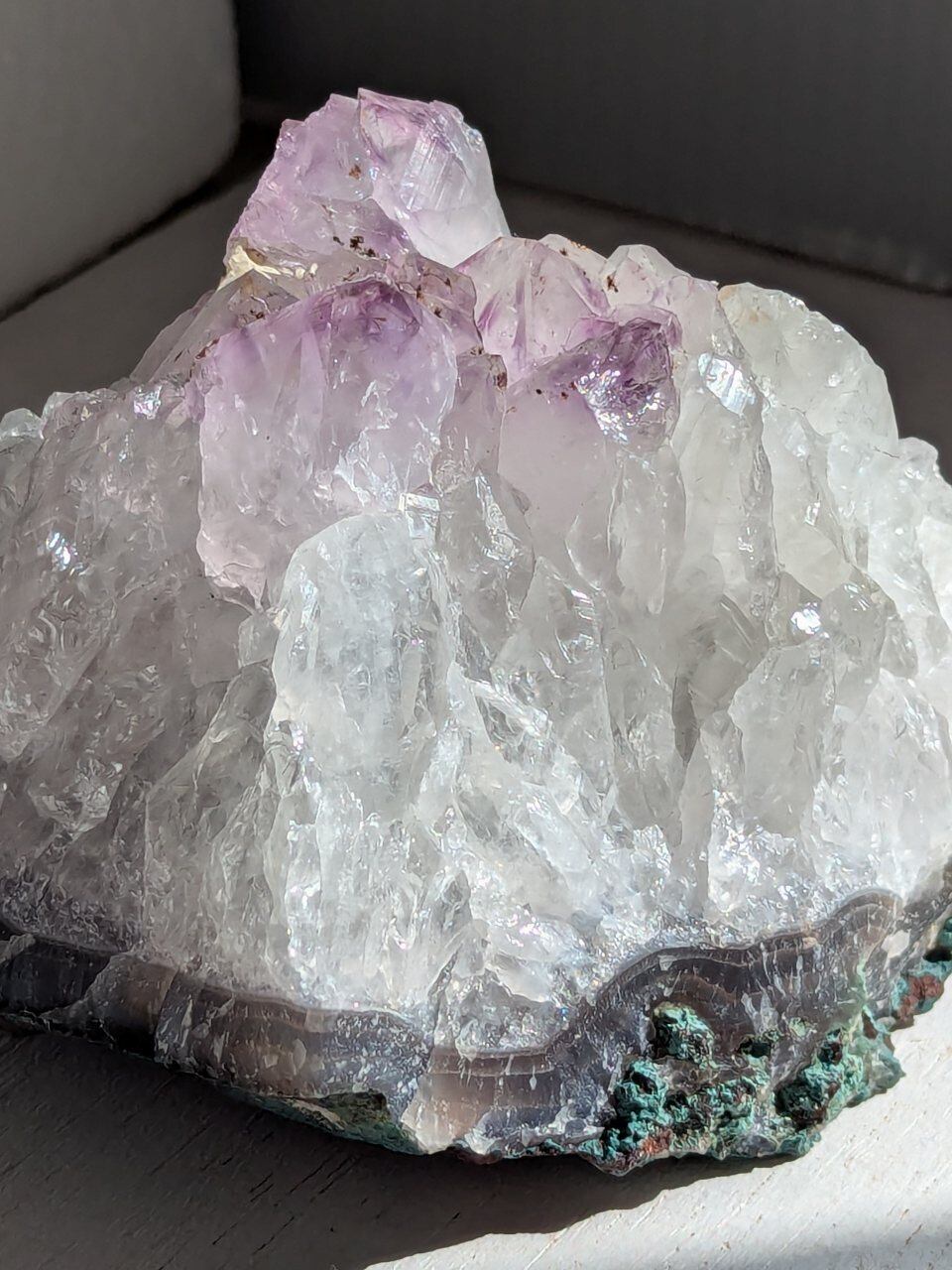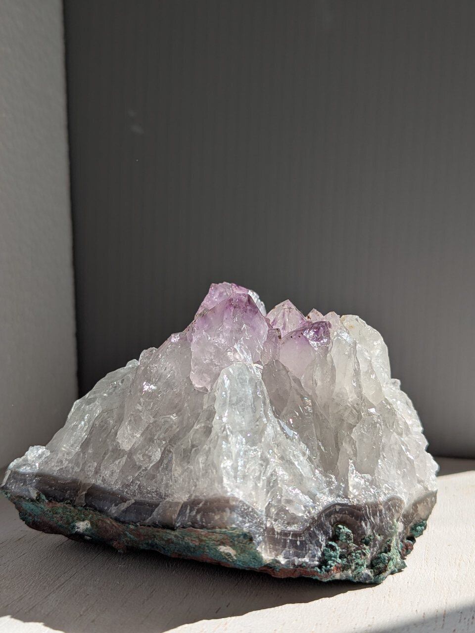 水晶の雪山の山頂にアメシストの紫シロップをかけたのかな?なアメシストクラスターです