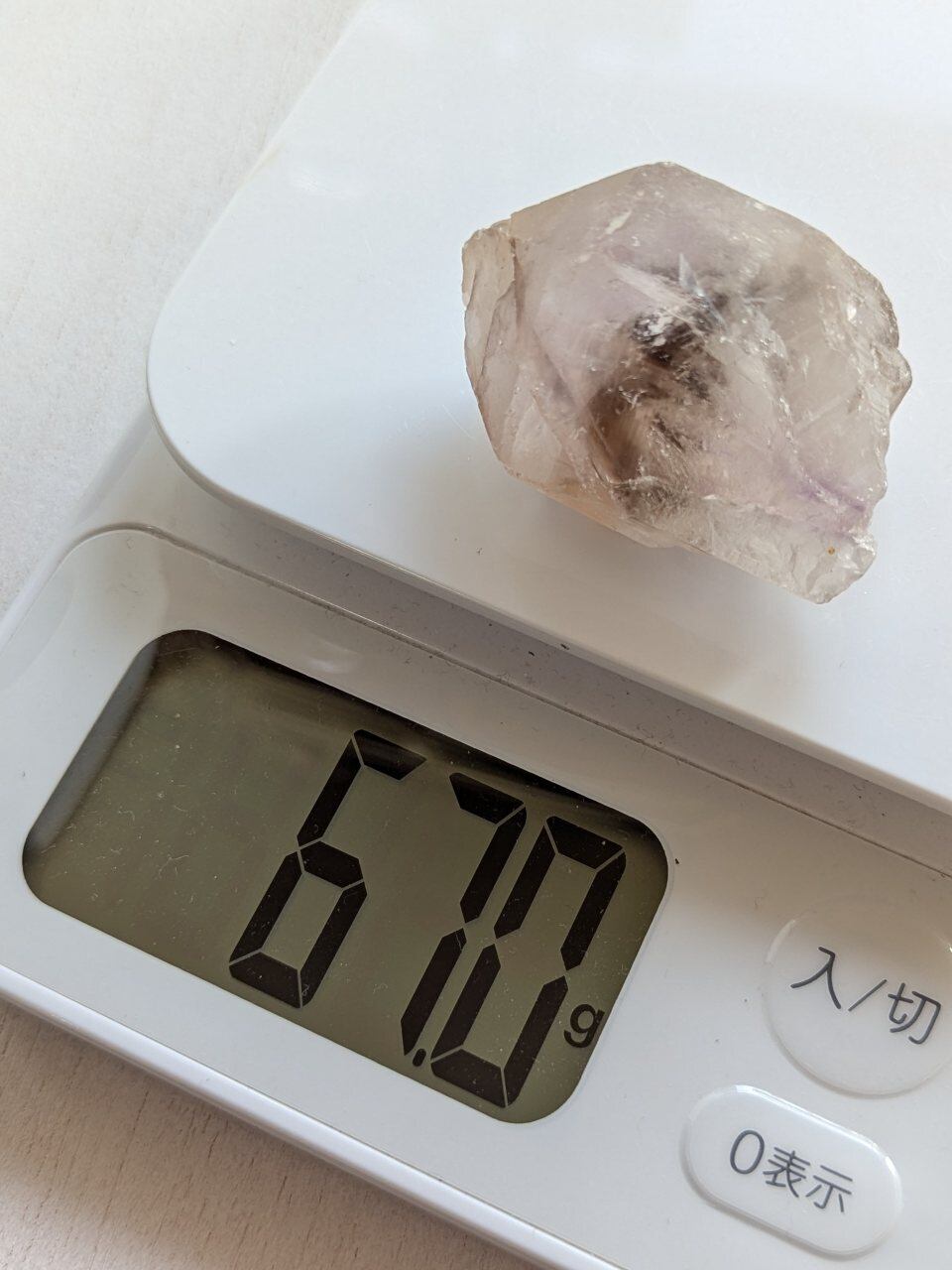 つや消し氷砂糖でコーティングしたお菓子の中にジュレや餡が入っているようなナチュラルな水晶ポイントにアメシスト混じりスモーキーファントムがみられます。