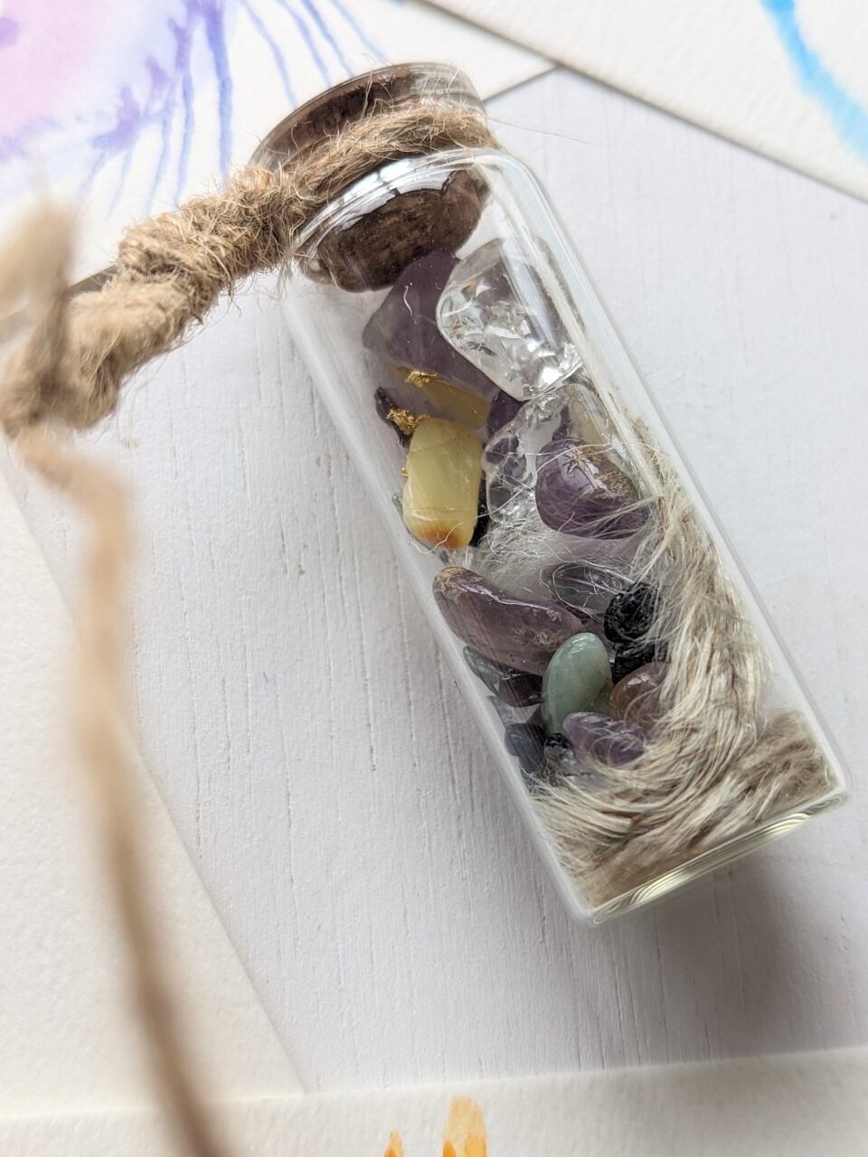 鉱物、植物、海の民、アロマオイルetcとルーン文字、ラテン語等で小瓶に詰め合わせ繋いだおまもりです