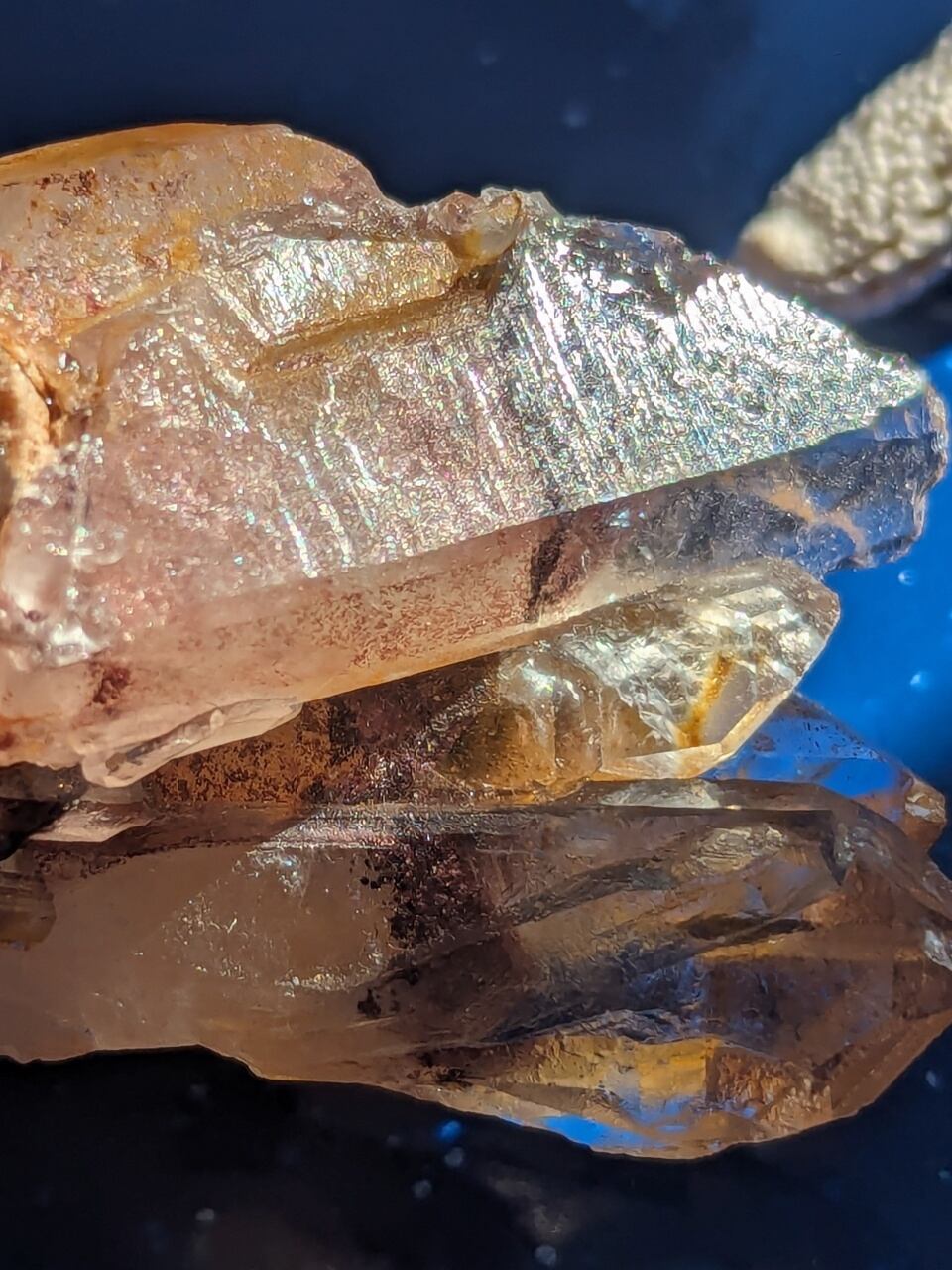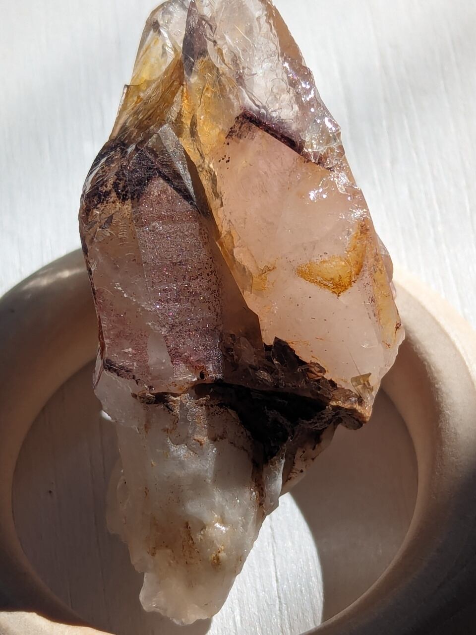 水晶の成長が一旦止まった所に鉄分が酸化して赤く発色したものが付着し、さらに水晶は成長することでファントムとなります。